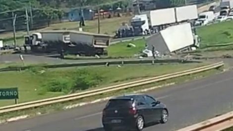 Imagens de câmeras de segurança registraram a colisão entre duas carretas no Contorno Norte de Maringá, na região do Jardim Sumaré, na tarde desta...