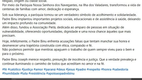 A comunidade católica da Ilha dos Valadares, em Paranaguá, tem se mobilizado em apoio ao padre Binu Joseph Chollackal, afastado preventivamente pela...
