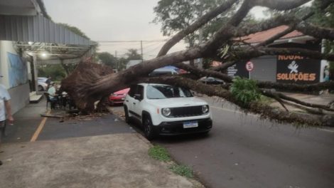 Os fortes ventos que atingiram Maringá no início da noite de sexta-feira (17) derrubaram uma árvore de grande porte sobre um Jeep estacionado na rua...