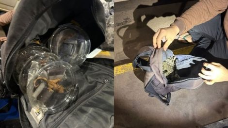 Agentes da Receita Federal apreenderam 12 jacarés, 10 lagartixas de crista, uma sucuri e um filhote de píton, todos vivos, dentro da mochila de um...