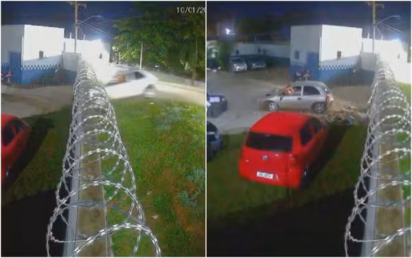 Um carro bateu contra o muro e invadiu o batalhão da Guarda Civil Municipal de Cidade Ocidental, no Entorno do Distrito Federal, na madrugada deste sábado (10), após o motorista perder o controle da direção. Uma câmera de segurança registrou o momento em que o veículo avança em alta velocidade e chega a “voar” antes da colisão.