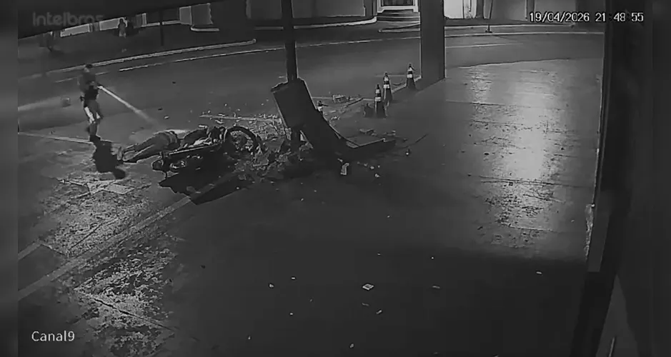 Câmeras de segurança flagraram o momento de um grave acidente na noite de sábado (19) no centro de Faxinal, no Vale do Ivaí. Uma motocicleta que fugia de uma abordagem da Polícia Militar colidiu violentamente e a passageira foi lançada contra um poste.