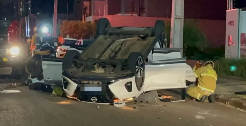 Idoso avança placa de ‘pare’, capota e fica preso às ferragens em acidente no Jardim Canadá