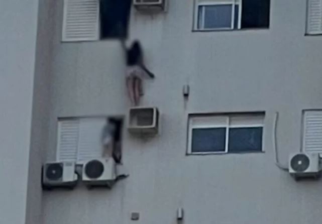 Nas imagens mais próximas, um homem aparece segurando uma mulher apoiada sobre o suporte do ar-condicionado, tentando evitar que ela caísse. Populares no térreo gritam “Cuidado, Lincon!” e “Segura, pelo amor de Deus!”, enquanto o fogo consome o apartamento.