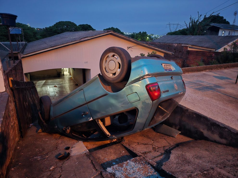 Um carro capotou no final da tarde desta quinta-feira (23) na Rua Pioneiro João Pinheiro Dantas, Parque Itaipu, em Maringá. A motorista, que transportava dois filhos, descia pela Rua Piapara quando, por motivo ainda não esclarecido, o veículo atingiu um obstáculo, capotou e invadiu o quintal de uma residência.