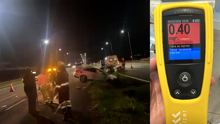 Após ser atendido, o condutor realizou o teste do etilômetro, que indicou 0,40 mg/L de álcool por litro de ar expelido, valor que configura crime de embriaguez ao volante. Ele foi preso em flagrante e permanece internado sob custódia. Após alta médica, será encaminhado à Polícia Civil.