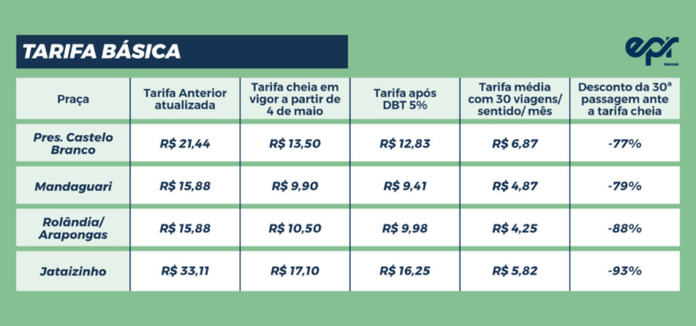 Os valores cobrados em cada trecho são os seguintes: Presidente Castelo Branco, R$ 13,50; Mandaguari, R$ 9,90; Rolândia/Arapongas, R$ 10,50; Jataizinho, R$ 17,10.