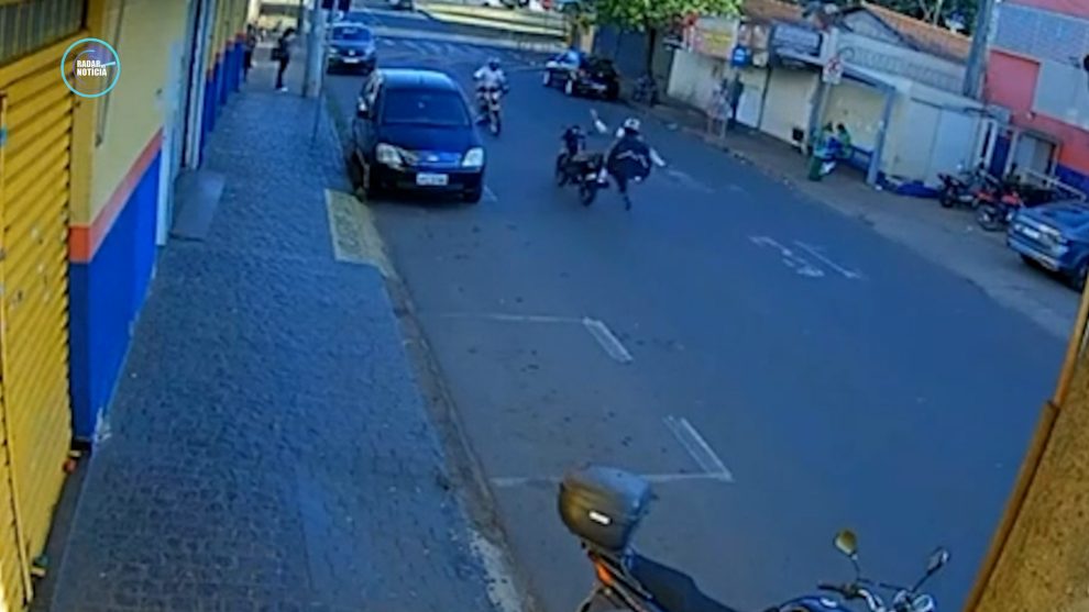 Nas imagens, é possível ver o momento em que o suspeito acelera na contramão e salta da moto instantes antes da colisão. A vítima, também em uma motocicleta, foi atingida em cheio e arremessada para frente, caindo ao solo. O suspeito derrapou próximo ao veículo e conseguiu se levantar rapidamente antes de deixar o local.
